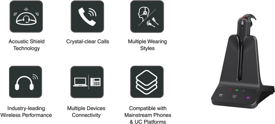 WH63 E2 is a convertible DECT wireless headset that supports multi-device connection and control. It offers a more flexible and efficient call experience, making it suitable for diverse office environments